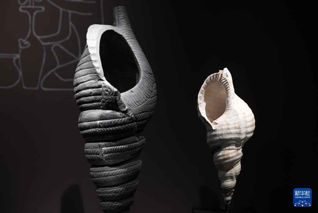 展出的“特里同”海螺形蛇纹石来通杯(左)和天然“特里同”海螺壳(4月14日摄)。