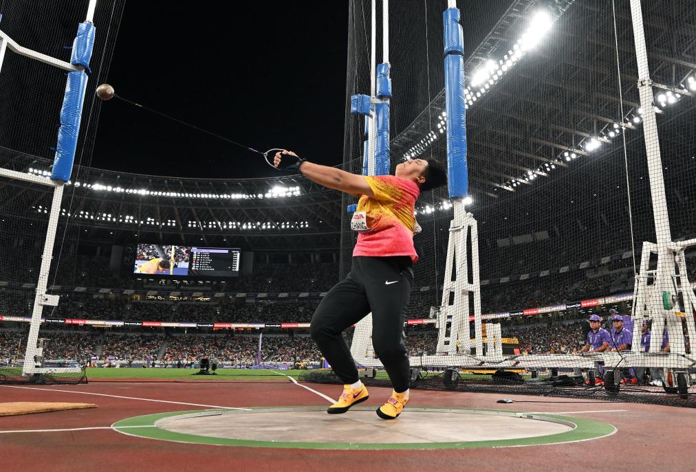 9月15日,2025年世界田径锦标赛女子链球决赛在日本东京举行,图为中国选手张家乐在比赛中试投。新华社记者 宋彦桦 摄