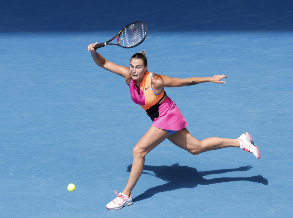 1月25日,萨巴伦卡在比赛中回球。新华社记者 马平 摄