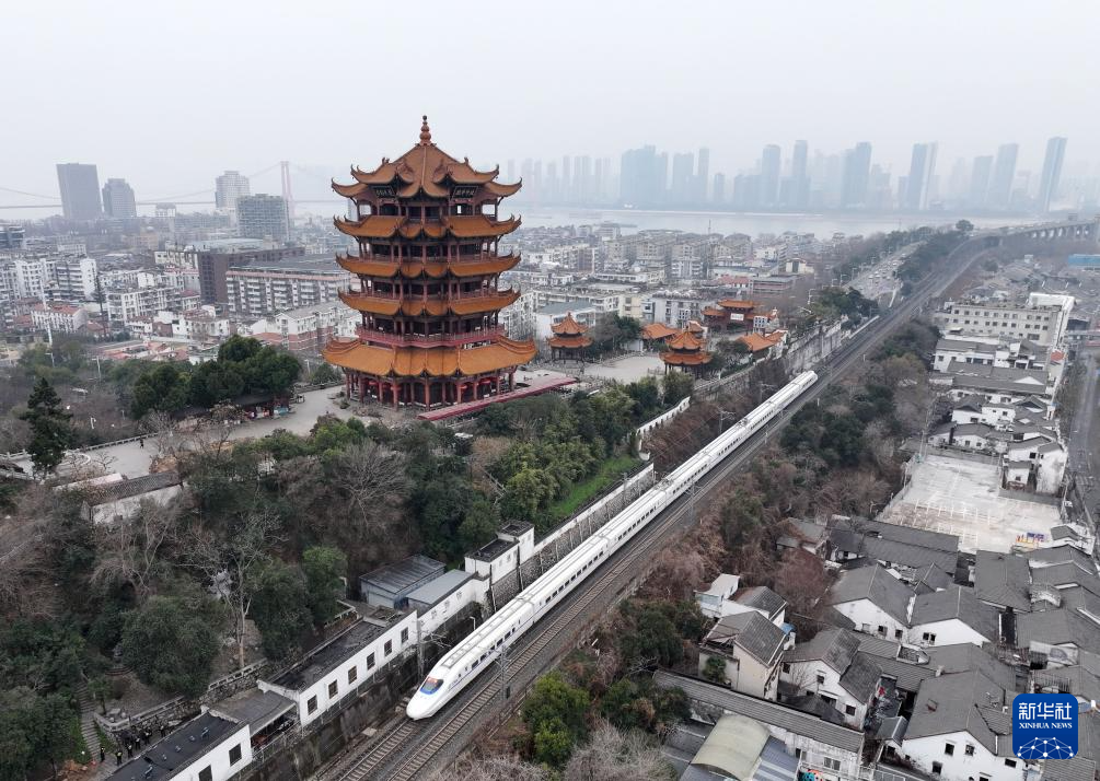 1月25日,一列动车组列车经过湖北省武汉市黄鹤楼景区(无人机照片)。