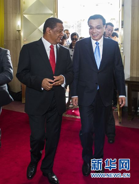 國務(wù)院總理李克強當(dāng)?shù)貢r間6日上午在亞的斯亞貝巴國家宮會見埃塞俄比亞總統(tǒng)穆拉圖。