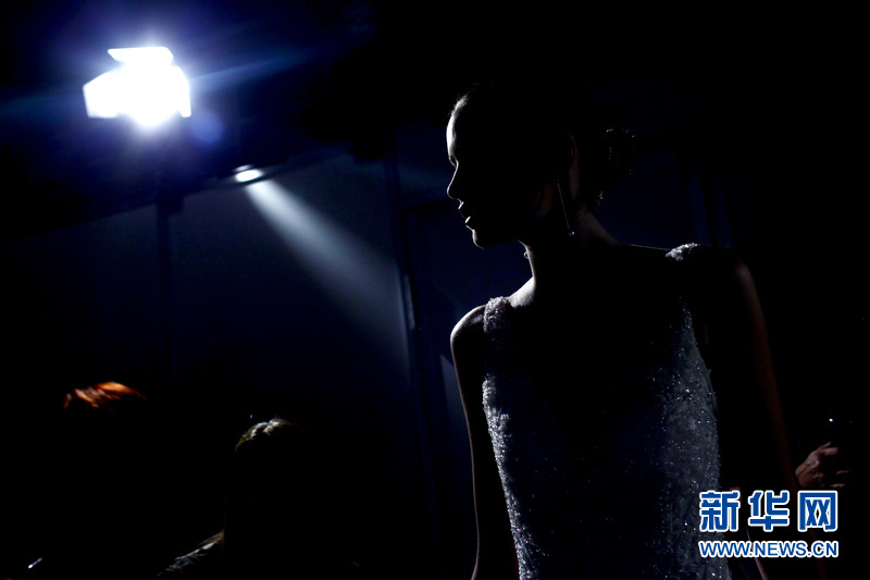 場(chǎng)外正在準(zhǔn)備登臺(tái)展示婚紗的模特。