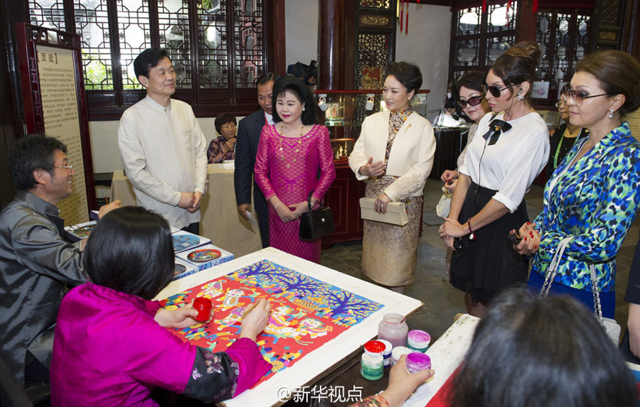 ????彭麗媛和貴賓們?cè)谠@靜觀(guān)的展臺(tái)前駐足停留,聽(tīng)取介紹。彭麗媛不時(shí)拿起面塑、扎染布等傳統(tǒng)手工藝品給貴賓們欣賞?!稗r(nóng)民畫(huà)用的是什么顏料?”“木版水印和版畫(huà)有什么區(qū)別?”“扎染布會(huì)褪色嗎?”……大家紛紛提問(wèn),同非物質(zhì)文化遺產(chǎn)傳承人親切交流。