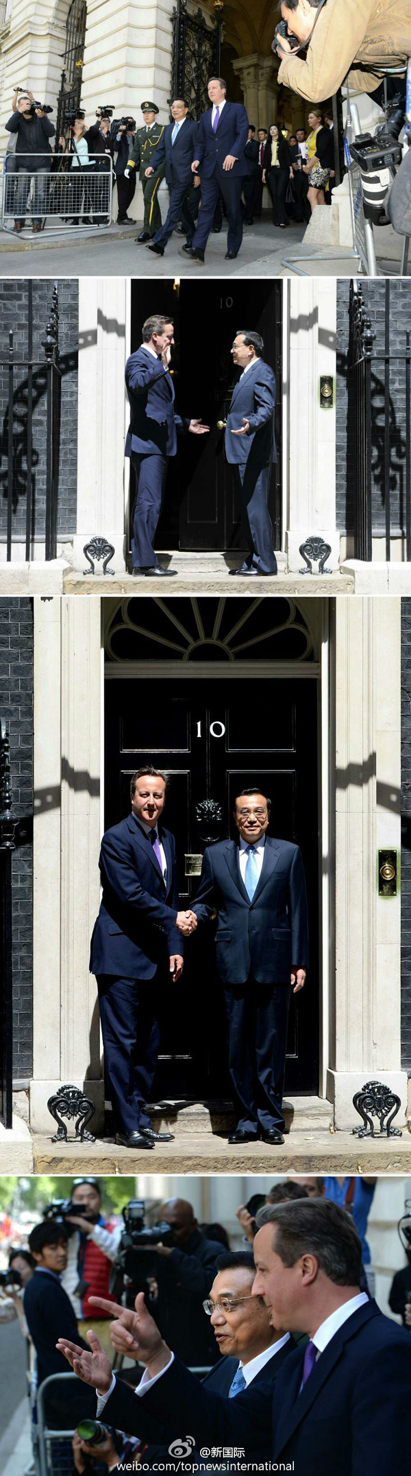 新華網(wǎng)北京6月17日電 據(jù)新華社“新國際”微博報(bào)道,17日,英國首相府所在的唐寧街附近五星紅旗飄揚(yáng),卡梅倫為到訪的李克強(qiáng)總理舉行隆重歡迎儀式。隨后,兩位領(lǐng)導(dǎo)人步行來到首相官邸。面對中外記者的鏡頭,李克強(qiáng)與卡梅倫握手合影,愉快交談。在首相府一層內(nèi)閣會(huì)議室內(nèi),兩位領(lǐng)導(dǎo)人就雙邊關(guān)系和共同關(guān)心的問題舉行會(huì)談。