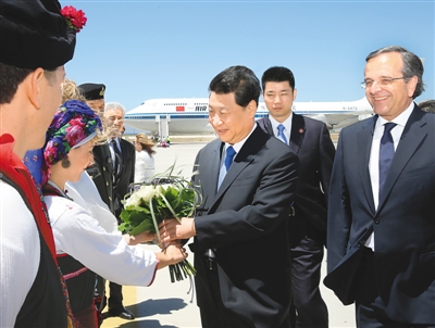 習近平抵達羅德島迪亞哥拉斯機場時,希臘總理薩馬拉斯專程從首都雅典前來,并率多名內(nèi)閣部長和羅德市市長到機場歡迎。習近平在舷梯旁同薩馬拉斯握手,互致問候。身著當?shù)貍鹘y(tǒng)服裝的希臘青年向習近平獻花。希臘禮兵沿紅地毯兩側(cè)列隊,向習近平行注目禮。