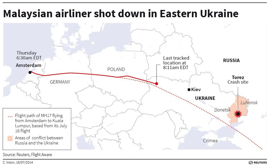 當(dāng)?shù)貢r間7月17日,一架從阿姆斯特丹起飛的馬航客機(jī)在烏克蘭領(lǐng)空與地面失去聯(lián)系。這架飛機(jī)墜毀在烏克蘭頓涅茨克州斯涅日諾耶居民點(diǎn)附近,機(jī)上298人全部遇難。英國路透社繪制了一張客機(jī)路線圖。