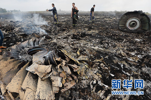 ????在烏克蘭境內(nèi)墜毀的馬航MH17客機(jī)殘骸。這是7月17日在靠近俄羅斯邊界的烏克蘭東部地區(qū)拍攝的客機(jī)墜毀現(xiàn)場(chǎng)。新華社發(fā)