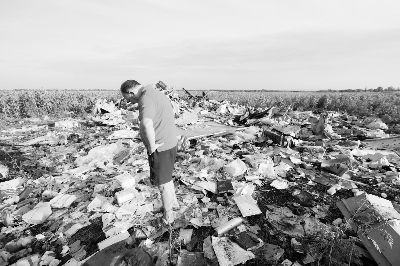 19日,在烏克蘭頓涅茨克州,一名當(dāng)?shù)孛癖娬驹隈R航MH17航班墜機現(xiàn)場 圖/新華社