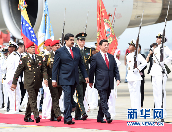 ????馬杜羅在機(jī)場(chǎng)為習(xí)近平舉行隆重歡迎儀式。兩國元首登上檢閱臺(tái)。軍樂團(tuán)奏委中兩國國歌,升中國國旗。習(xí)近平在馬杜羅陪同下檢閱儀仗隊(duì)。