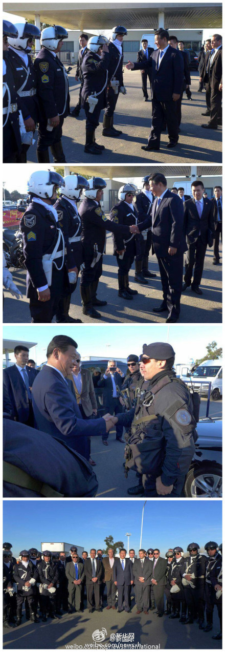????新華網(wǎng)北京7月21日電 據(jù)新華社“新國際”微博報道,43小時的阿根廷之旅,佩戴頭盔、全副武裝的騎警們一路護衛(wèi),十分辛苦。20日上午,訪問即將結(jié)束,車隊來到埃塞伊薩國際機場外,得知騎警們按規(guī)定不進機場,習(xí)近平臨時要求停車,來到騎警們面前,同他們一一握手道別表示感謝,并合影。?