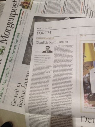 柏林市中心亞歷山大地鐵站的書報(bào)店里,洛塔爾·沙爾夫拿起一份報(bào)紙遞給我們:“今天的《世界報(bào)》上有你們總理發(fā)表的文章。”