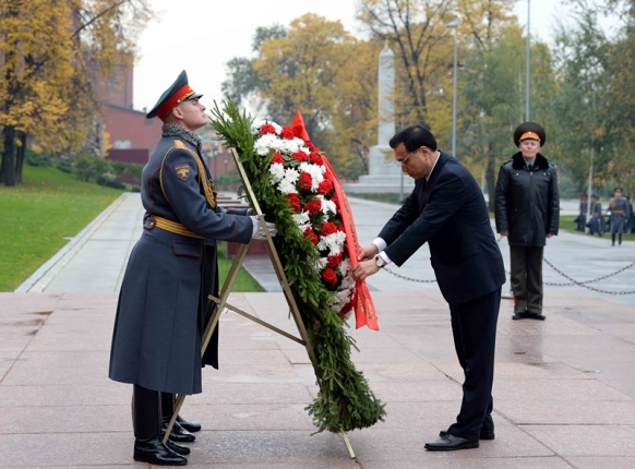 ??? 俄方為李克強(qiáng)總理安排的第一場(chǎng)正式活動(dòng)就是向克里姆林宮外的無(wú)名烈士墓獻(xiàn)花圈,意涵豐富深刻。