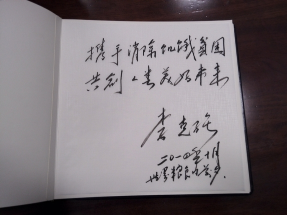 ????石板前面擺放著一張簽字桌,桌上放著一本叫做golden book(金書)的簽到簿,是專供到訪的國家領(lǐng)導(dǎo)人用的??藦娍偫碓谏厦鎸懴铝诉@樣一句話“攜手消除饑餓貧困 共創(chuàng)人類美好未來”。