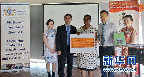 ????宋波向南茨瓦內教育廳捐贈漢語教材,中左宋波,中右陸志雷博士。新華社記者郭興華 攝
