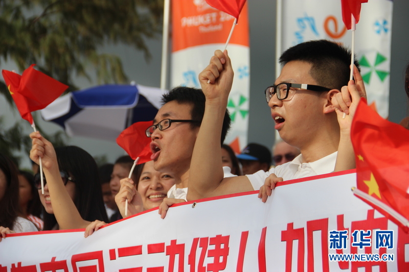 ??? 11月16日,普吉孔子學(xué)院的中國志愿者老師們?yōu)橹袊\(yùn)動(dòng)健兒加油。中國體育代表團(tuán)16日在泰國普吉舉行的第四屆亞洲沙灘運(yùn)動(dòng)會(huì)上勇奪2枚金牌和2枚銅牌。當(dāng)天比賽全部結(jié)束時(shí),中國隊(duì)以3金2銀5銅的成績暫列獎(jiǎng)牌榜第五,東道主泰國隊(duì)以9金11銀12銅的成績暫列金牌榜和獎(jiǎng)牌榜第一。新華社記者楊云燕攝