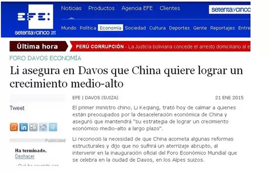 22日,西班牙埃菲社報道了李克強總理在達沃斯世界經(jīng)濟論壇上的致辭,特別提到他就中國經(jīng)濟增速放緩的回應(yīng)。報道中引用李克強總理的話:“中國經(jīng)濟進入新常態(tài),經(jīng)濟由高速增長轉(zhuǎn)為中高速增長。發(fā)展則必須由中低端水平邁向中高端水平,為此要堅定不移地推動結(jié)構(gòu)性改革?!?/p>