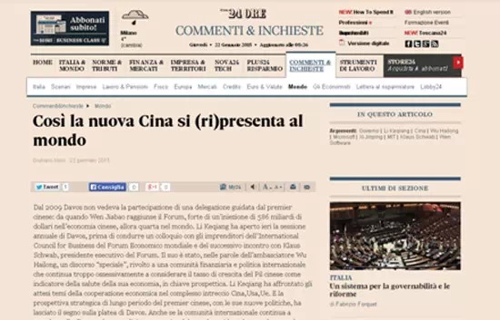 意大利24小時太陽報1月22日發(fā)表題為《中國重新向世界自我介紹》的評論性文章,介紹了李克強在世界經(jīng)濟論壇上的講話。文章稱,雖然國際社會一直在用西方國家的種族主義中心心態(tài)以及舊的眼光看待中國,中國國務(wù)院總理李克強的長期戰(zhàn)略眼光和他的新政策還是給達沃斯的聽眾們留下深刻印象。