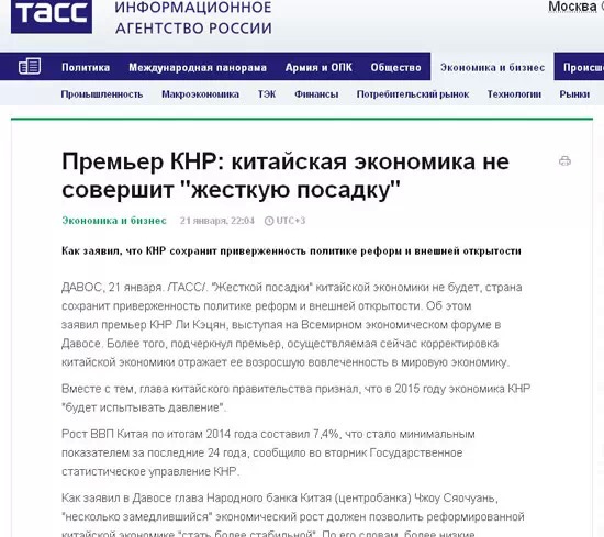 塔斯社發(fā)表了一篇名為《中國總理:中國經(jīng)濟不會硬著陸》的文章。文中指出,李克強和中國央行行長周小川在達沃斯論壇期間均表示,中國將深化改革開放,漸緩的增長速度有利于中國經(jīng)濟的轉(zhuǎn)型。在3月份舉行的中國兩會上,中國政府將提出新的經(jīng)濟發(fā)展規(guī)劃,速度肯定不會是北京追求的首要目標(biāo)。