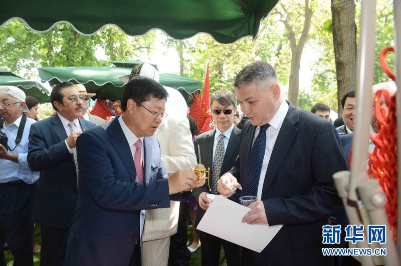 ????中國駐烏茲別克斯坦大使孫立杰向?yàn)跬饨徊扛吖俸透鲊v烏大使介紹中國佳肴。沙達(dá)提攝
