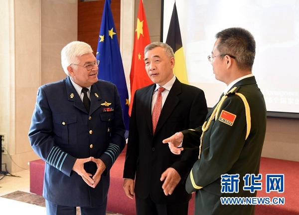 ??? 7月23日,中國駐比利時大使曲星(中)、比利時國防參謀長范卡倫貝格(Gerard Van Caelenberge)(左)與中國駐比利時王國陸、海、空三軍武官郜彤在招待會上友好交談。新華社記者姜巖攝