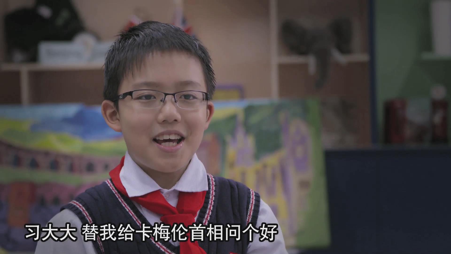 短片結(jié)尾處還有“彩蛋”,成都龍江路小學(xué)分校學(xué)生鮮博文最后說:“習(xí)大大,替我給卡梅倫首相問個(gè)好,我見過他的!”