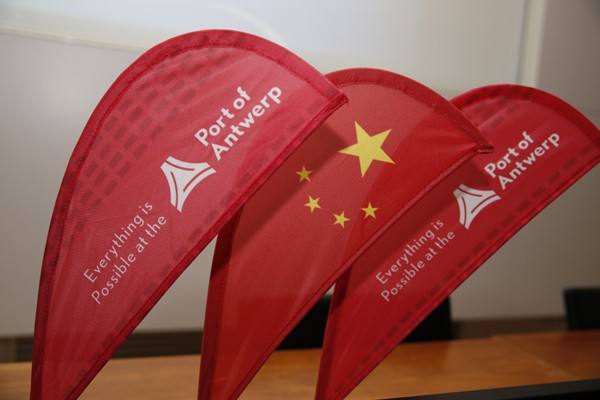 ↑會(huì)場(chǎng)的中國(guó)國(guó)旗與安特衛(wèi)普港標(biāo)識(shí)。