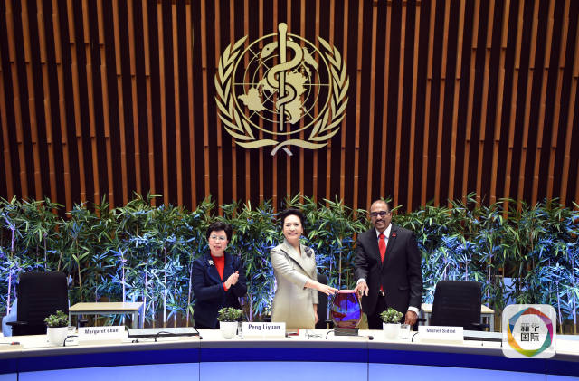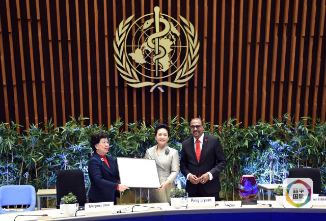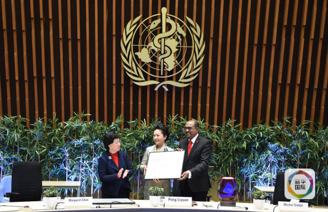 1月18日,國家主席習近平夫人、世界衛(wèi)生組織結核病和艾滋病防治親善大使彭麗媛應世界衛(wèi)生組織總干事陳馮富珍和聯(lián)合國艾滋病規(guī)劃署執(zhí)行主任西迪貝邀請,在瑞士日內瓦出席為她舉行的親善大使任期續(xù)延暨頒獎儀式。這是世界衛(wèi)生組織總干事陳馮富珍向彭麗媛頒發(fā)親善大使任期續(xù)延證書。(新華社記者謝環(huán)馳攝)
