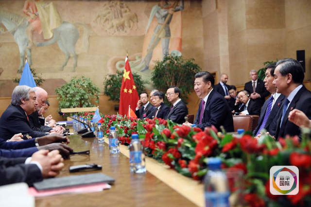 1月18日,國家主席習(xí)近平在瑞士日內(nèi)瓦萬國宮會(huì)見第71屆聯(lián)合國大會(huì)主席湯姆森和聯(lián)合國秘書長(zhǎng)古特雷斯。(新華社記者蘭紅光攝)
