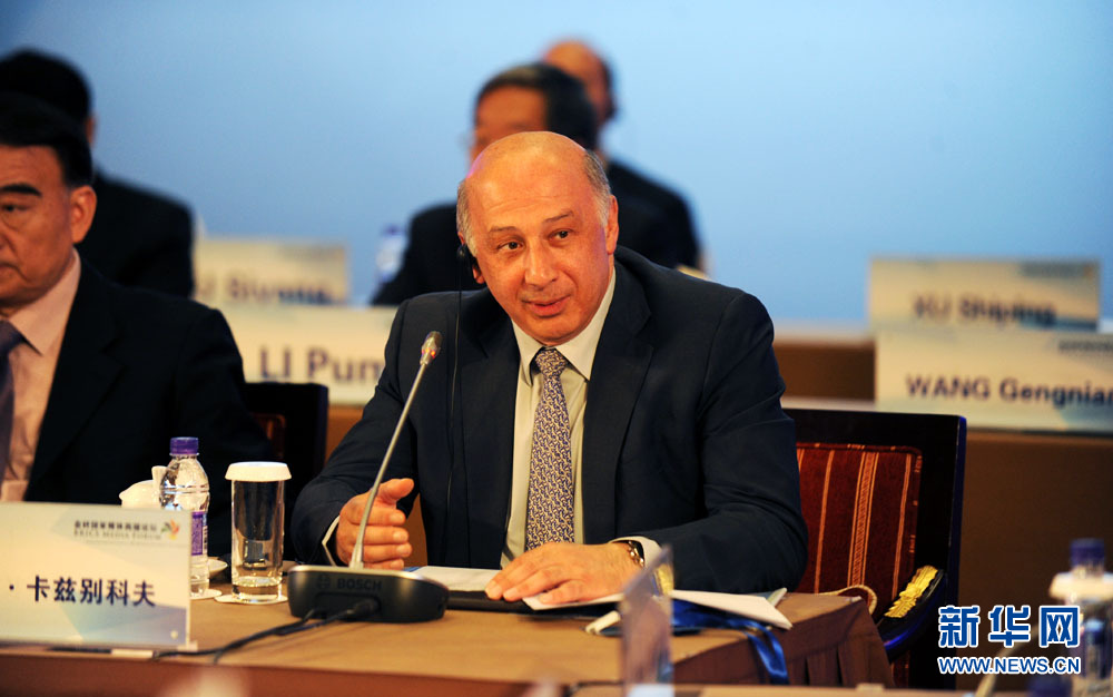 金磚國(guó)家媒體高端論壇開幕式6月8日在北京舉行。圖為金磚國(guó)家新開發(fā)銀行副行長(zhǎng)卡茲別科夫致辭。 新華網(wǎng) 孫韜 攝