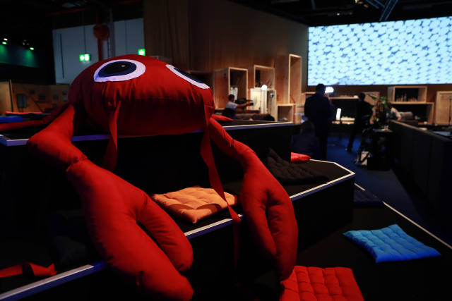 ↑這是7月6日在德國漢堡拍攝的G20領(lǐng)導(dǎo)人峰會國際新聞中心餐飲區(qū)擺放的螃蟹造型玩偶。新華社記者羅歡歡攝