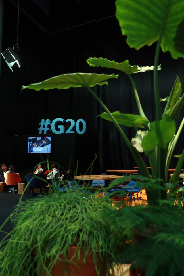 ↑這是7月6日在德國漢堡拍攝的G20領(lǐng)導(dǎo)人峰會國際新聞中心內(nèi)擺放的植物。新華社記者羅歡歡攝