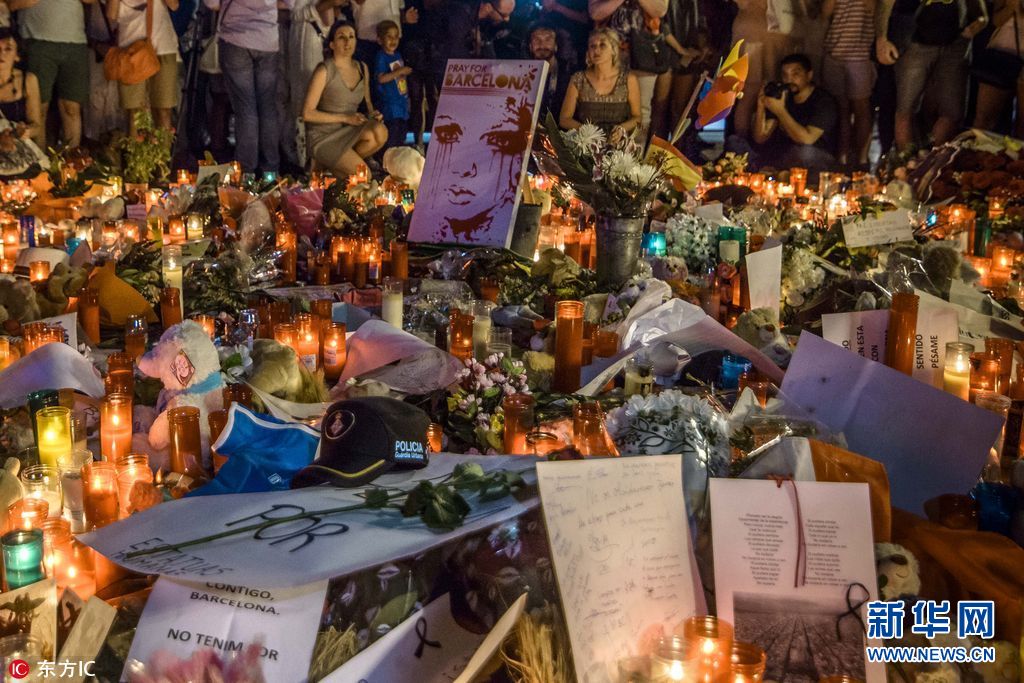 當(dāng)?shù)貢r間2017年8月18日,西班牙巴塞羅那,當(dāng)?shù)孛癖婞c燭獻(xiàn)花悼念恐襲事件遇難者。17日,一輛白色貨車在巴塞羅那市中心蘭布拉大道加泰羅尼亞廣場附近沖撞人群,據(jù)媒體報道,死亡人數(shù)已經(jīng)升至14人。(圖片來源:東方IC)