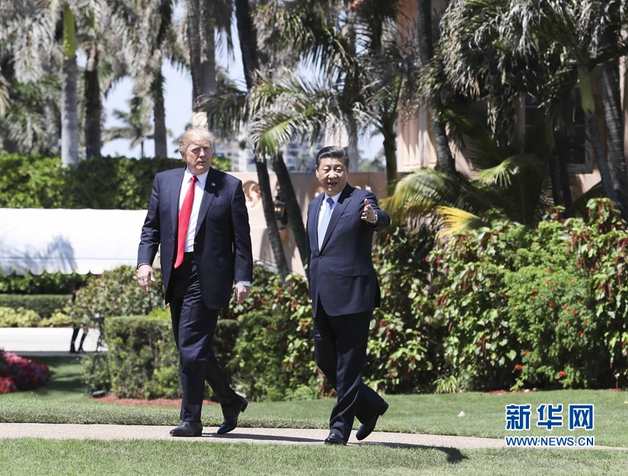 2017年4月7日,國家主席習(xí)近平在美國佛羅里達(dá)州海湖莊園同美國總統(tǒng)特朗普舉行中美元首第二場正式會(huì)晤。會(huì)晤后,習(xí)近平同特朗普到秀麗宜人的海湖莊園中散步,在輕松友好的氣氛中繼續(xù)就兩國友好合作進(jìn)行討論。 新華社記者 蘭紅光 攝