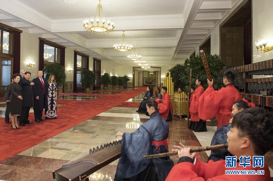 11月9日,國家主席習(xí)近平在北京人民大會(huì)堂東門外廣場舉行歡迎儀式,歡迎美利堅(jiān)合眾國總統(tǒng)唐納德·特朗普對中國進(jìn)行國事訪問。這是習(xí)近平和夫人彭麗媛同特朗普夫婦在人民大會(huì)堂欣賞文藝表演。新華社記者 李學(xué)仁 攝