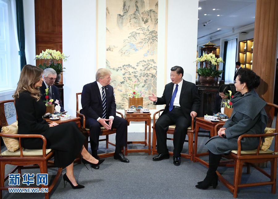 11月8日下午,國家主席習近平和夫人彭麗媛在北京故宮博物院迎接來華進行國事訪問的美國總統(tǒng)特朗普和夫人梅拉尼婭。兩國元首夫婦在寶蘊樓簡短茶敘。新華社記者蘭紅光攝