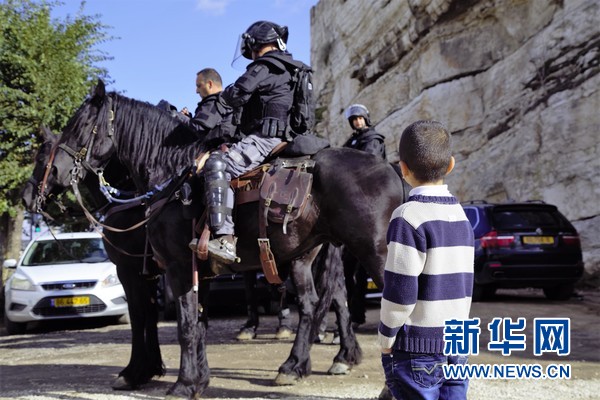 在耶路撒冷老城大馬士革門(mén)附近,一名巴勒斯坦小孩注視著騎在馬背上的以色列警察。記者陳文仙 攝