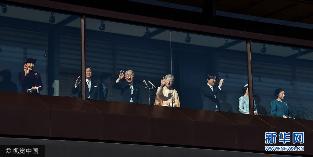 當(dāng)?shù)貢r間2017年12月23日,日本東京,日本明仁天皇慶祝84歲生日,在皇宮的陽臺上向祝福者揮手致意。(圖片來源:視覺中國)