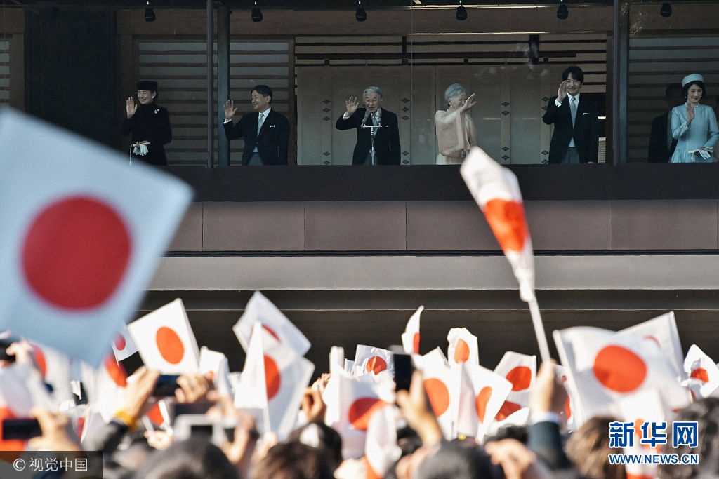 當(dāng)?shù)貢r間2017年12月23日,日本東京,日本明仁天皇慶祝84歲生日,在皇宮的陽臺上向祝福者揮手致意。(圖片來源:視覺中國)
