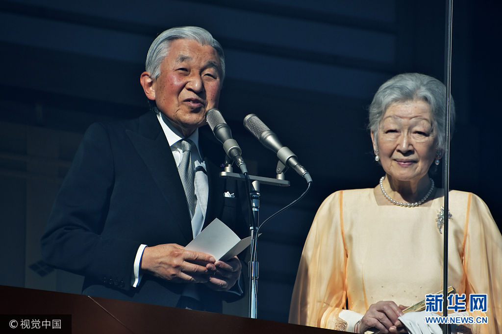 當?shù)貢r間2017年12月23日,日本東京,日本明仁天皇慶祝84歲生日,在皇宮的陽臺上向祝福者揮手致意。(圖片來源:視覺中國)