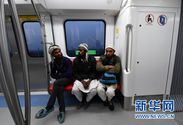 12月25日,在印度首都新德里洋紅色地鐵線,三名男子在乘車。當日,連接新德里及其衛(wèi)星城諾伊達(Noida)之間的洋紅色地鐵線建成通車。這條線路全長12.64公里。德里地鐵公司計劃未來提高這條地鐵線路自動化水平,以“無人值守模式”運行。目前,新德里運營地鐵線路共有7條,分別用顏色命名,包括紅色、黃色、藍色、綠色、橙色、紫羅蘭和洋紅色。新華網發(fā) (張迺杰 攝)