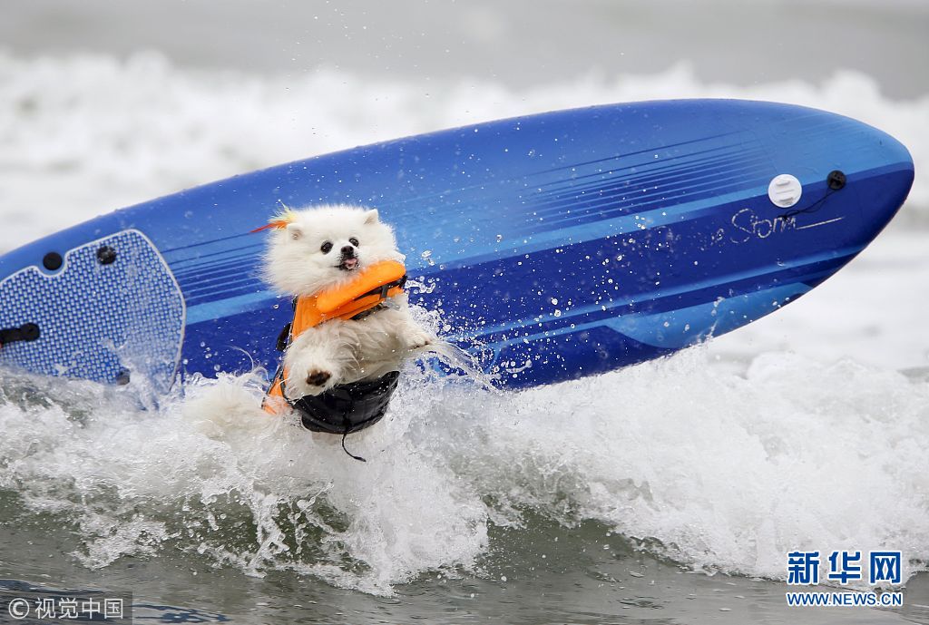 當(dāng)?shù)貢r(shí)間2015年8月1日,美國加利福尼亞州因皮里爾灘舉辦第十屆狗狗沖浪比賽,可愛“汪星人”海浪中展開激烈角逐。(圖片來源:視覺中國)