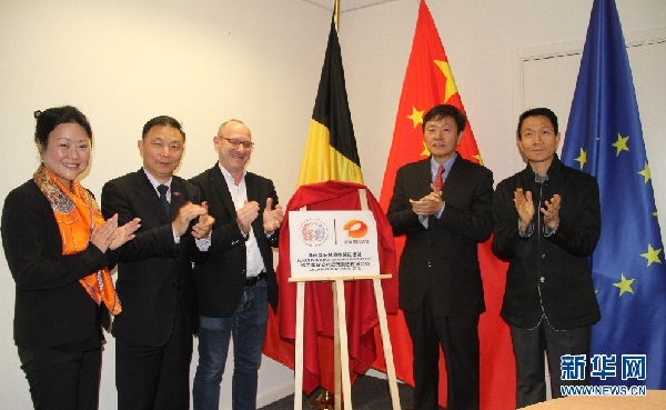 中國駐歐盟使團(tuán)公使銜參贊李建民(前排左二)、中國駐比利時大使館文化參贊向世海(前排右一)、湖南衛(wèi)視國際頻道總監(jiān)甘霖(前排右二)和比利時法語廣播電視臺的特別代表(前排左三)共同為聯(lián)絡(luò)處揭牌。新華網(wǎng)發(fā)(潘革平攝)