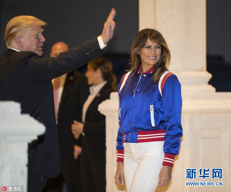 當(dāng)?shù)貢r(shí)間2018年2月4日,美國(guó)佛州西棕櫚灘,美國(guó)總統(tǒng)特朗普與第一夫人梅拉尼婭在高爾夫俱樂部觀看大學(xué)生樂隊(duì)的歡迎演出,與美女啦啦隊(duì)員握手。據(jù)悉,特朗普夫婦出席在該俱樂部舉辦的超級(jí)碗派對(duì)。(圖片來(lái)源:東方IC)
