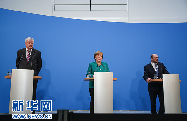 ??? 2月7日,在德國柏林的基民盟總部,德國總理、聯(lián)盟黨領(lǐng)導(dǎo)人默克爾(中),社會民主黨主席舒爾茨(右)和基社盟主席澤霍費爾出席新聞發(fā)布會。據(jù)德國媒體報道,德國聯(lián)盟黨(由基民盟和基社盟組成)和社會民主黨(社民黨)7日就聯(lián)合組閣協(xié)議達(dá)成一致。 新華社記者單宇琦攝