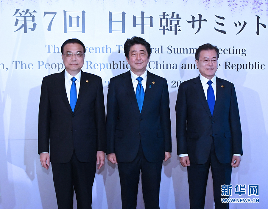 當?shù)貢r間5月9日上午,國務(wù)院總理李克強在東京迎賓館同日本首相安倍晉三、韓國總統(tǒng)文在寅共同出席第七次中日韓領(lǐng)導(dǎo)人會議。 新華社記者饒愛民 攝