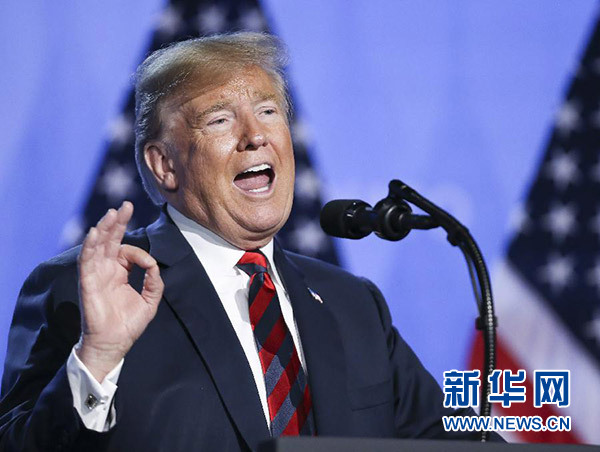 7月12日,在比利時布魯塞爾的北約總部,美國總統(tǒng)特朗普召開新聞發(fā)布會。新華社記者 葉平凡 攝