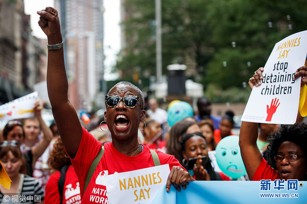 當?shù)貢r間2018年7月18日,美國紐約,包括托兒所從業(yè)人員、父母及其子女在內(nèi)的社會各界人士在美國移民和海關執(zhí)法局(ICE)附近組織示威游行,抗議特朗普政府近期在美國南部邊境實施針對非法移民家庭的強制拘留和家庭成員離散政策。當天,共和黨領導的眾議院通過了支持ICE的決議,并譴責一些民主黨人和進步積極分子要求廢除ICE的呼聲。(圖片來源:視覺中國)