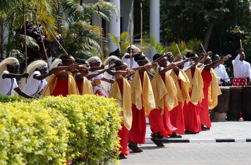 盛裝禮兵英姿挺拔,向尊貴的客人行注目禮。鼓聲響起,盧旺達民眾身著靚麗民族服裝,跳起熱情的迎賓舞,時而舒展柔緩,時而剛健有力。兩國元首駐足觀看,揮手致意。