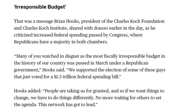 另外,科赫兄弟還表示他們不會(huì)再像以前那樣輕易支持共和黨的議員了,因?yàn)檫@些議員并沒有履行他們競(jìng)選時(shí)的承諾,反而是一直在支持美國(guó)政府的一些違背市場(chǎng)的政策,比如在今年3月的一項(xiàng)加大政府財(cái)政開支的法案。