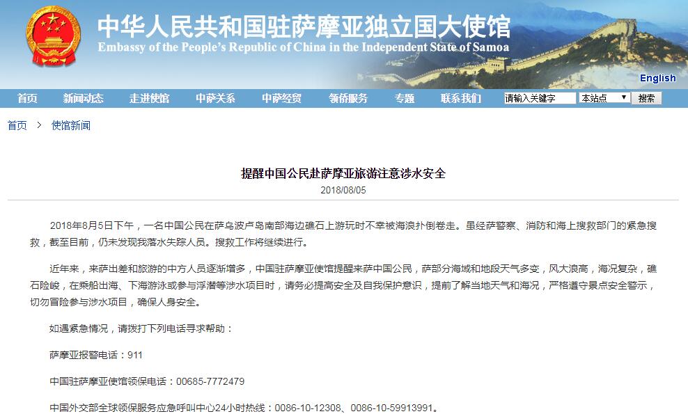 據(jù)中國駐薩摩亞大使館網(wǎng)站消息,當(dāng)?shù)貢r間2018年8月5日下午,一名中國公民在薩烏波盧島南部海邊礁石上游玩時不幸被海浪撲倒卷走。雖經(jīng)薩警察、消防和海上搜救部門的緊急搜救,截至目前,仍未發(fā)現(xiàn)落水失蹤人員。搜救工作將繼續(xù)進(jìn)行。